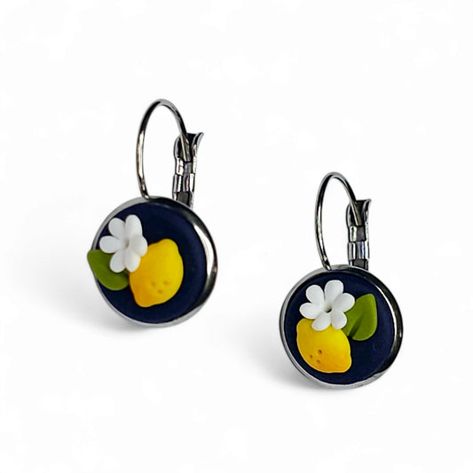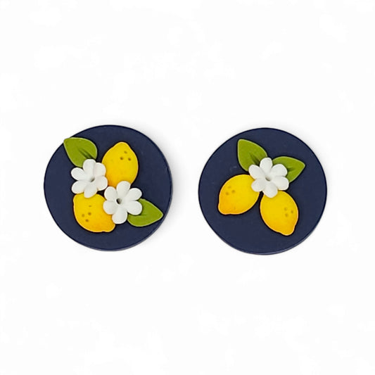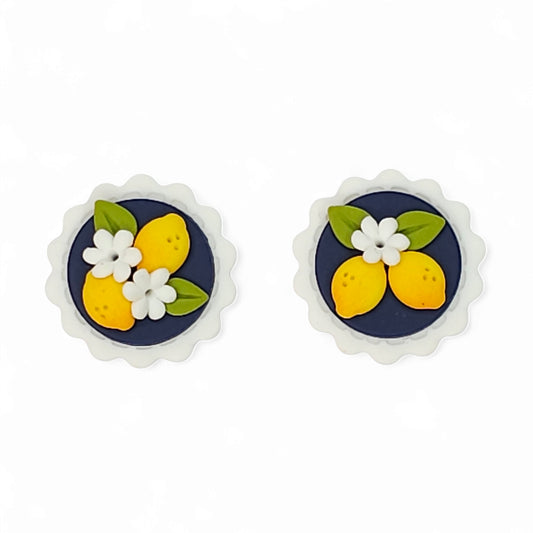 Καρφωτά σκουλαρίκια στρογγυλά κίτρινα λεμόνια σε μπλε φόντο με δαντέλα από πολυμερικό πηλό