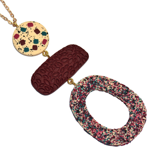 Μεγάλο μακρύ κολιέ μπορντό μπεζ πιτσιλωτό από πολυμερικό πηλό