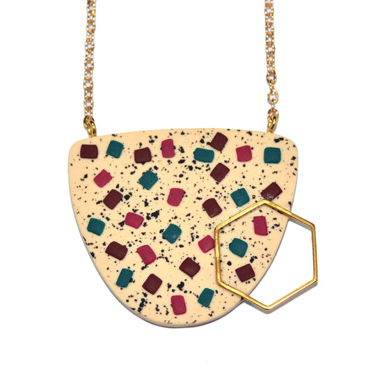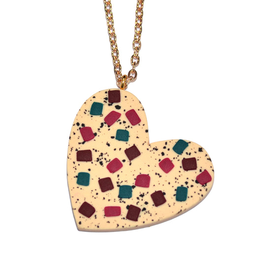 Κολιέ μακρύ καρδιά με μοτίβο μπεζ πιτσιλωτό με μπορντό φούξια γαλαζοπράσινο