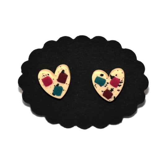 Καρφωτά σκουλαρίκια καρδούλες μπεζ πιτσιλωτά με μπορντό φούξια γαλαζοπράσινο