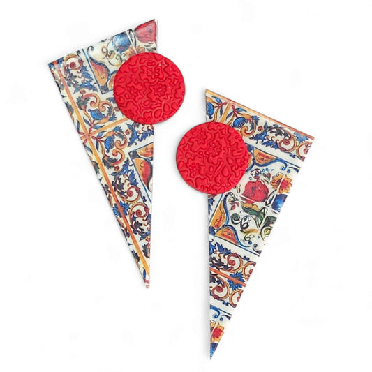Καρφωτά σκουλαρίκια μεγάλα τρίγωνα με μοτίβο πολύχρωμα πλακάκια από πολυμερικό πηλό