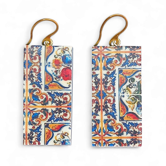 Μεγάλα κρεμαστά παραλληλόγραμμα σκουλαρίκια με μοτίβο πολύχρωμα πλακάκια από πολυμερικό πηλό