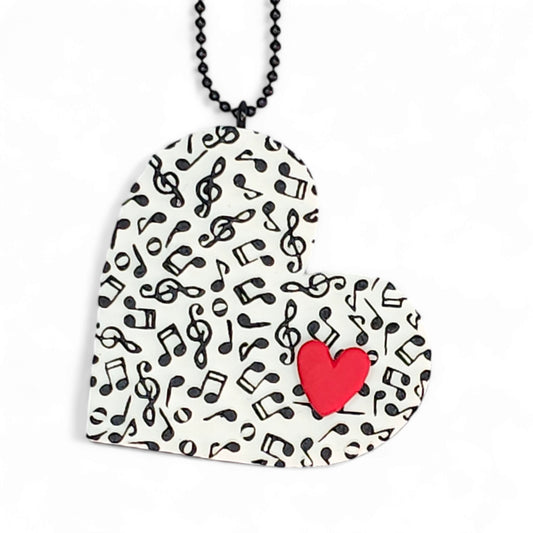 Ασπρόμαυρο στρογγυλό κολιέ με νότες και μια κόκκινη μικρή καρδούλα από πολυμερικό πηλό