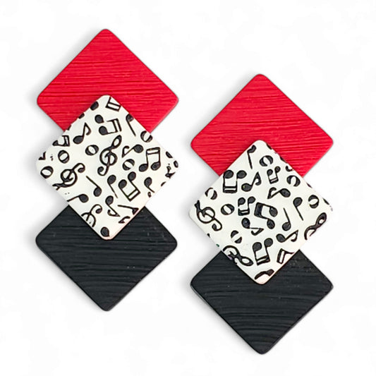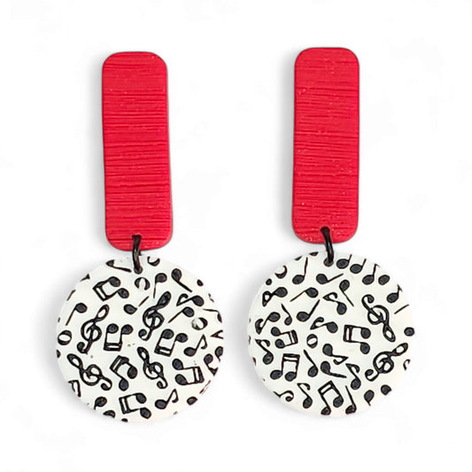 Κρεμαστά σκουλαρίκια ασπρόμαυρα με μουσικές νότες και κόκκινα στοιχεία από πολυμερικό πηλό