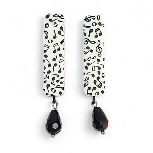 Κρεμαστά σκουλαρίκια ασπρόμαυρα δάκρυα με μουσικές νότες από πολυμερικό πηλό και μαύρα ατσάλινα καρφάκια ράβδοι