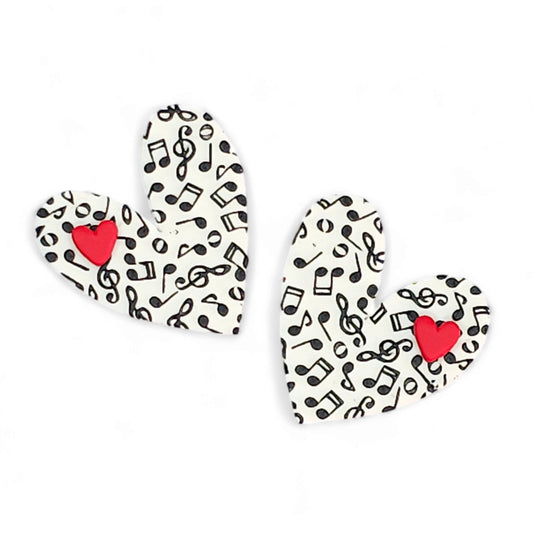 Ανόμοια καρφωτά σκουλαρίκια καρδιές μία με μουσικές νότες και μία κόκκινη από πολυμερικό πηλό