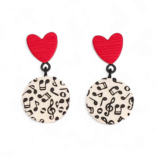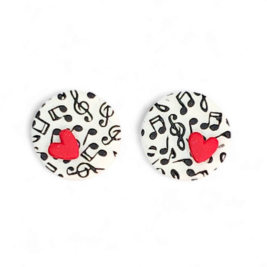 Ασπρόμαυρα καρφωτά στρογγυλά σκουλαρίκια με μουσικές νότες και κόκκινες καρδούλες από πολυμερικό πηλό