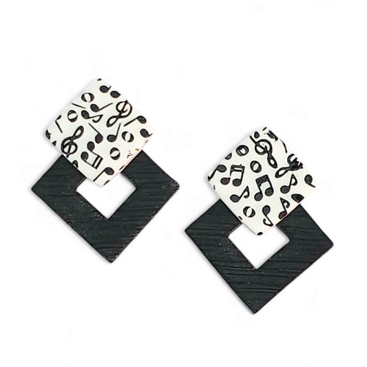 Ασπρόμαυρα καρφωτά σκουλαρίκια τετραγωνάκια με μουσικές νότες από πολυμερικό πηλό