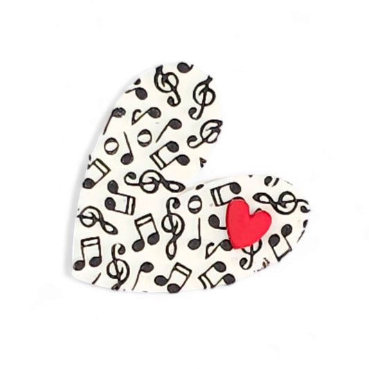 Ασπρόμαυρη καρφίτσα καρδιά με μουσικές νότες και μια κόκκινη μικρή καρδούλα από πολυμερικό πηλό