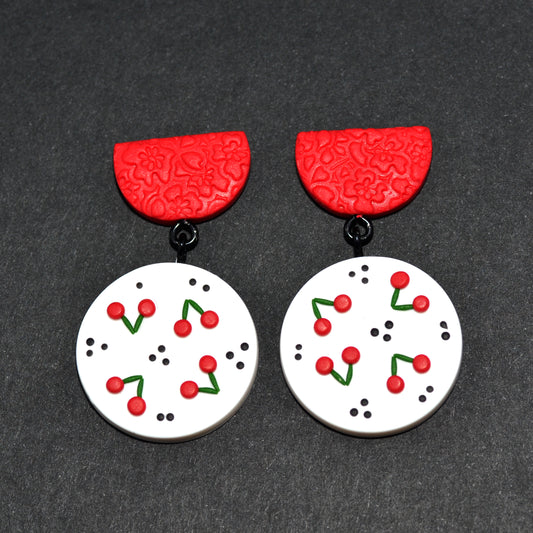 Καρφωτά σκουλαρίκια τετραγωνάκια κερασάκια σε μαύρο φόντο