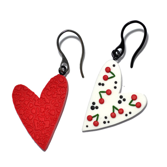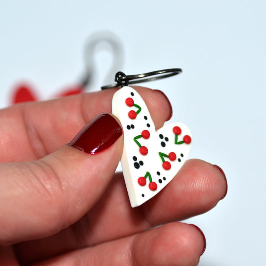 Κρεμαστά ανόμοια σκουλαρίκια καρδιές με κερασάκια σε λευκό φόντο