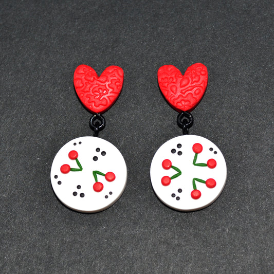 Γλυπτά κρεμαστά σκουλαρίκια κερασάκια σε λευκό φόντο και κόκκινες καρδιές από πολυμερικό πηλό