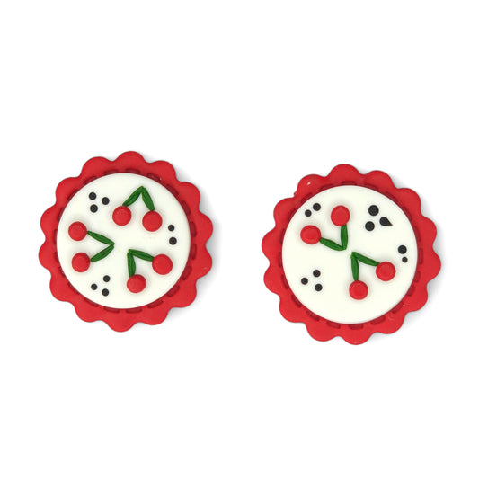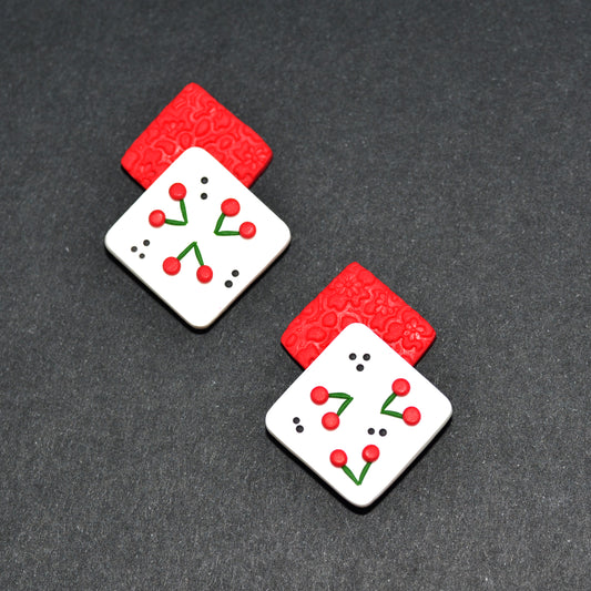 Καρφωτά σκουλαρίκια τετραγωνάκια με κερασάκια σε λευκό φόντο