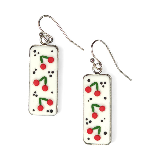 Κρεμαστά παραλληλόγραμμα σκουλαρίκια κερασάκια σε λευκό φόντο σε ατσάλινες βάσεις