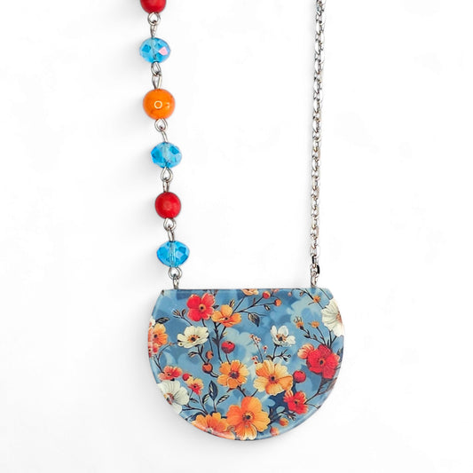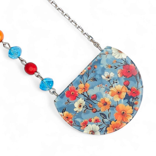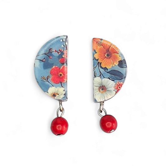 Σκουλαρίκια καρφωτά μικρά ημικύκλια με τεχνική μεταφοράς εικόνας σε πολυμερικό πηλό και κόκκινες πέτρες αχάτη