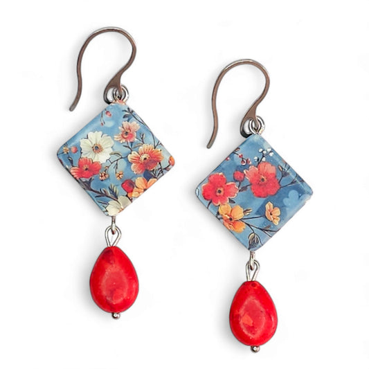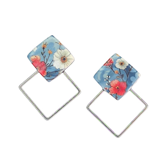 Μικρά κρεμαστά σκουλαρίκια τετραγωνάκια με τεχνική μεταφοράς εικόνας σε πολυμερικό πηλό και ατσάλινες βάσεις