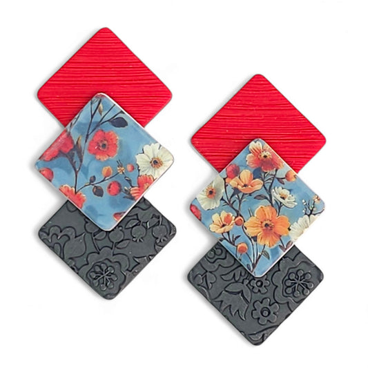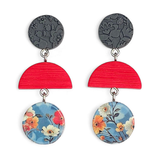 Κρεμαστά σκουλαρίκια με τεχνική μεταφοράς εικόνας σε πολυμερικό πηλό με κόκκινο και γκρι