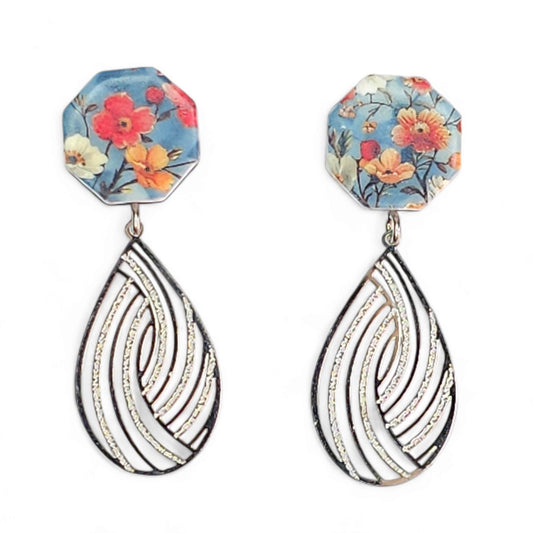 Κρεμαστά πολύγωνα σκουλαρίκια με τεχνική μεταφοράς εικόνας σε πολυμερικό πηλό και ατσάλινα δαντελένια φιλιγκράν σε σχήμα δάκρυ