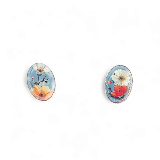 Μικρά οβάλ καρφωτά σκουλαρικάκια με τεχνική μεταφοράς εικόνας σε πολυμερικό πηλό σε ατσάλινες βάσεις