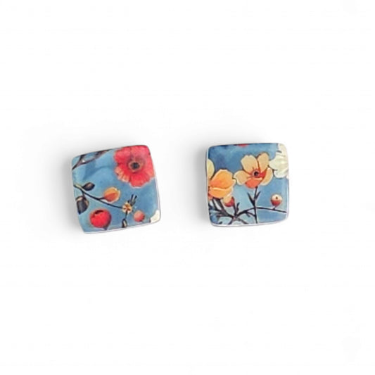 Σκουλαρίκια καρφωτά τετραγωνάκια με τεχνική μεταφοράς εικόνας σε πολυμερικό πηλό και ατσάλινα στοιχεία