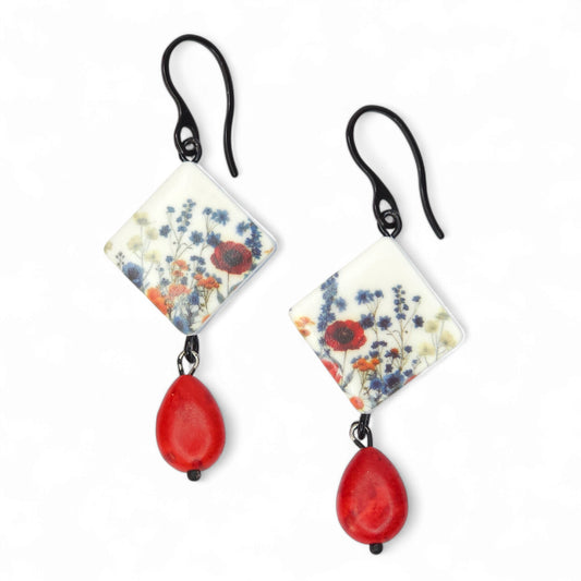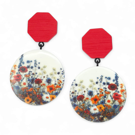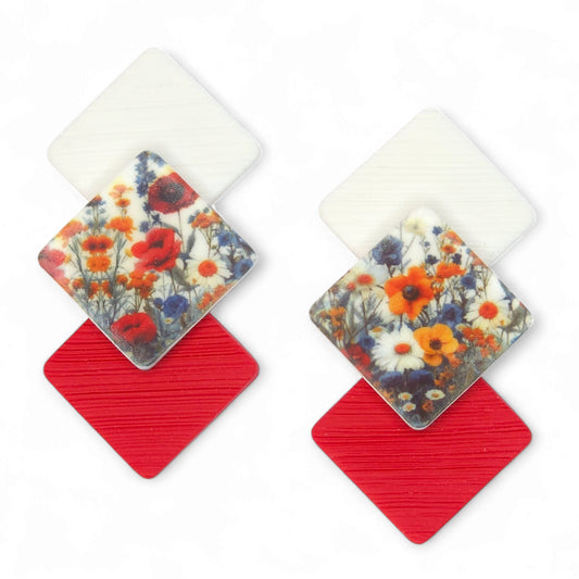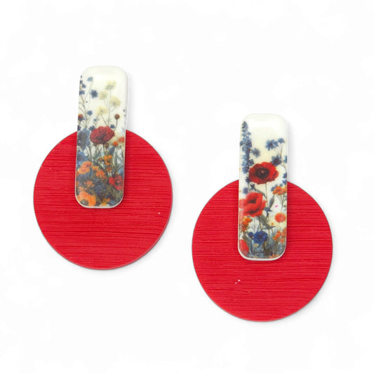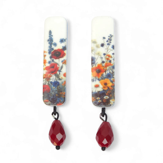 Καρφωτά κόκκινα σκουλαρίκια με παραλληλόγραμμο στοιχείο με μοτίβο λουλούδια του αγρού από πολυμερικό πηλό