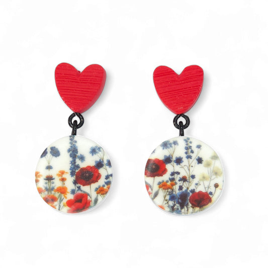 Κρεμαστά σκουλαρίκια με μοτίβο λουλούδια του αγρού από πολυμερικό πηλό και κόκκινες καρδιές