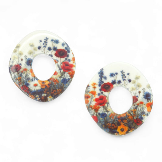Οβάλ κρεμαστά σκουλαρίκια με μοτίβο λουλούδια του αγρού από πολυμερικό πηλό