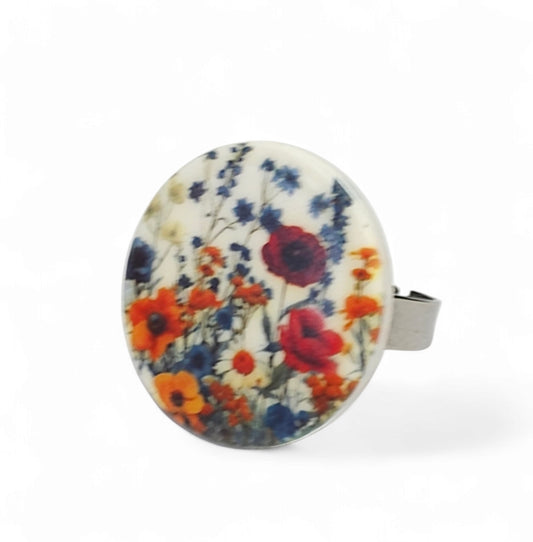 Στρογγυλό δαχτυλίδι με μοτίβο λουλούδια του αγρού από πολυμερικό πηλό και ατσάλινη βάση