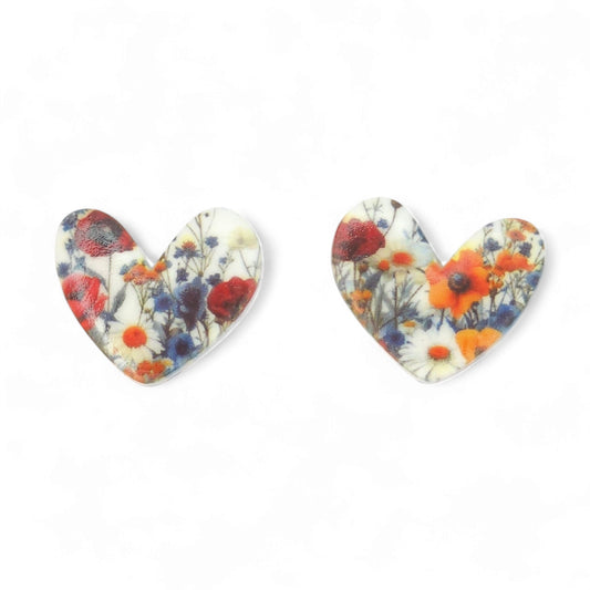 Καρφωτά σκουλαρίκια καρδιές με μοτίβο λουλούδια του αγρού από πολυμερικό πηλό