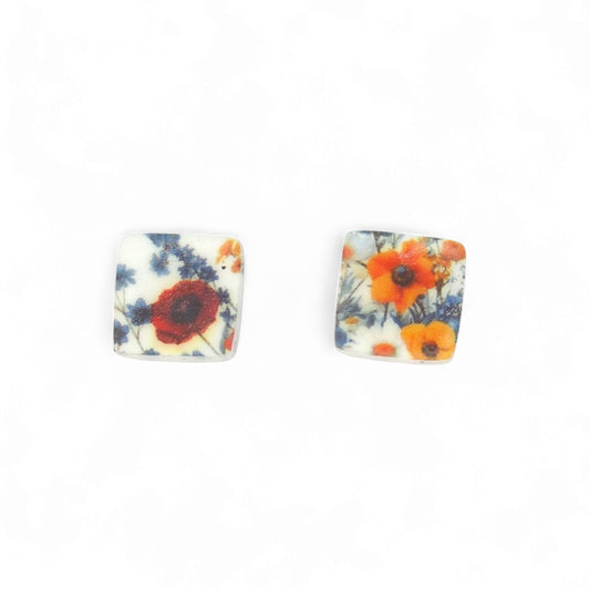 Μικρά καρφωτά σκουλαρίκια τετράγωνα με μοτίβο λουλούδια του αγρού από πολυμερικό πηλό