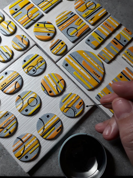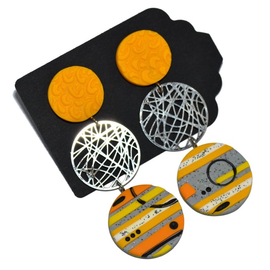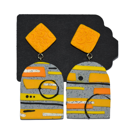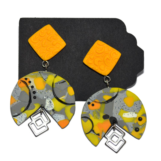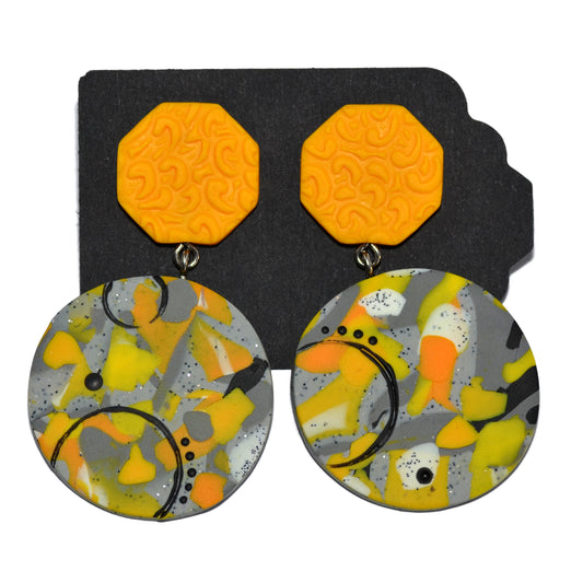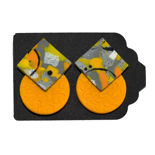 Μεγάλα καρφωτά σκουλαρίκια κίτρινος κύκλος και πιτσιλωτό γκρι τετράγωνο