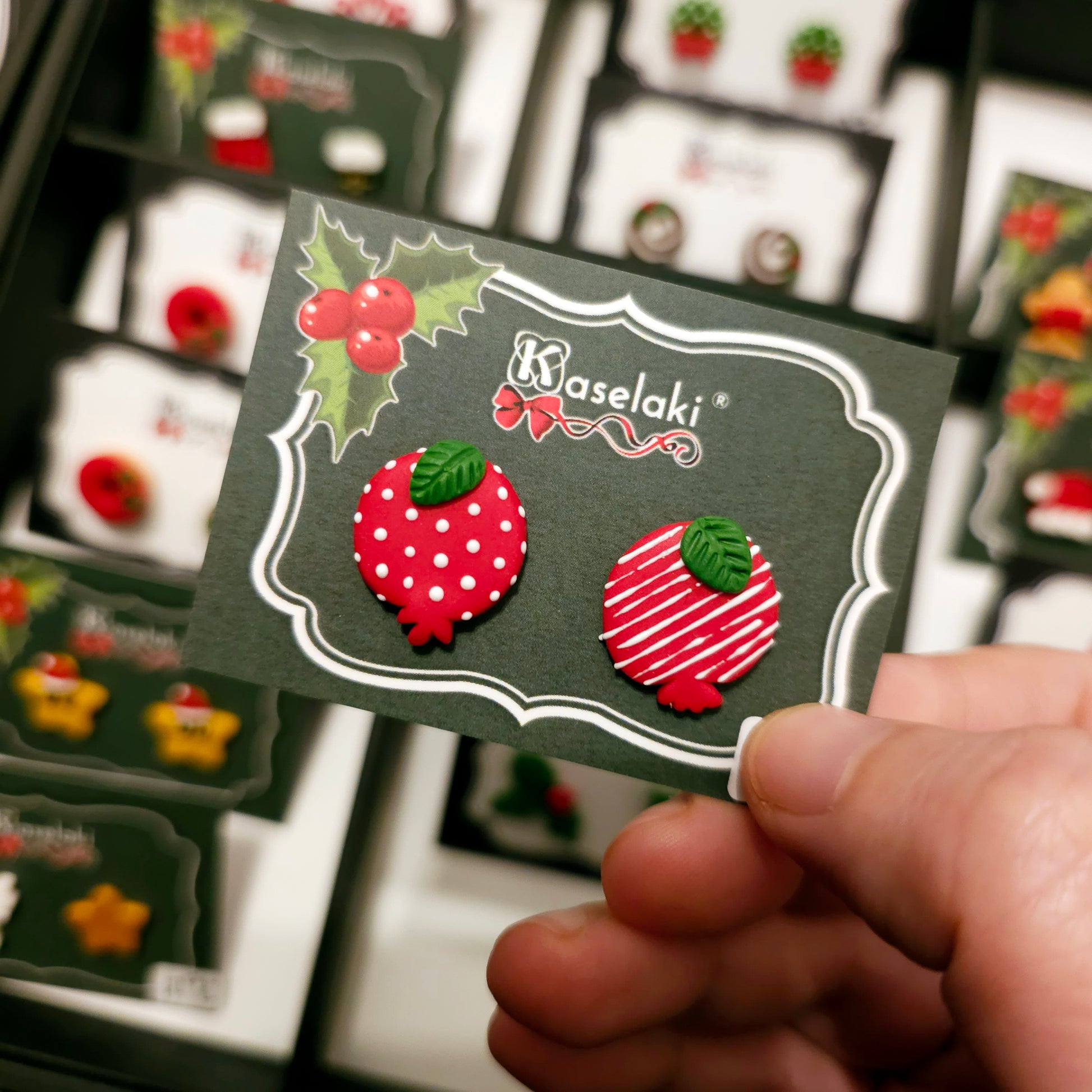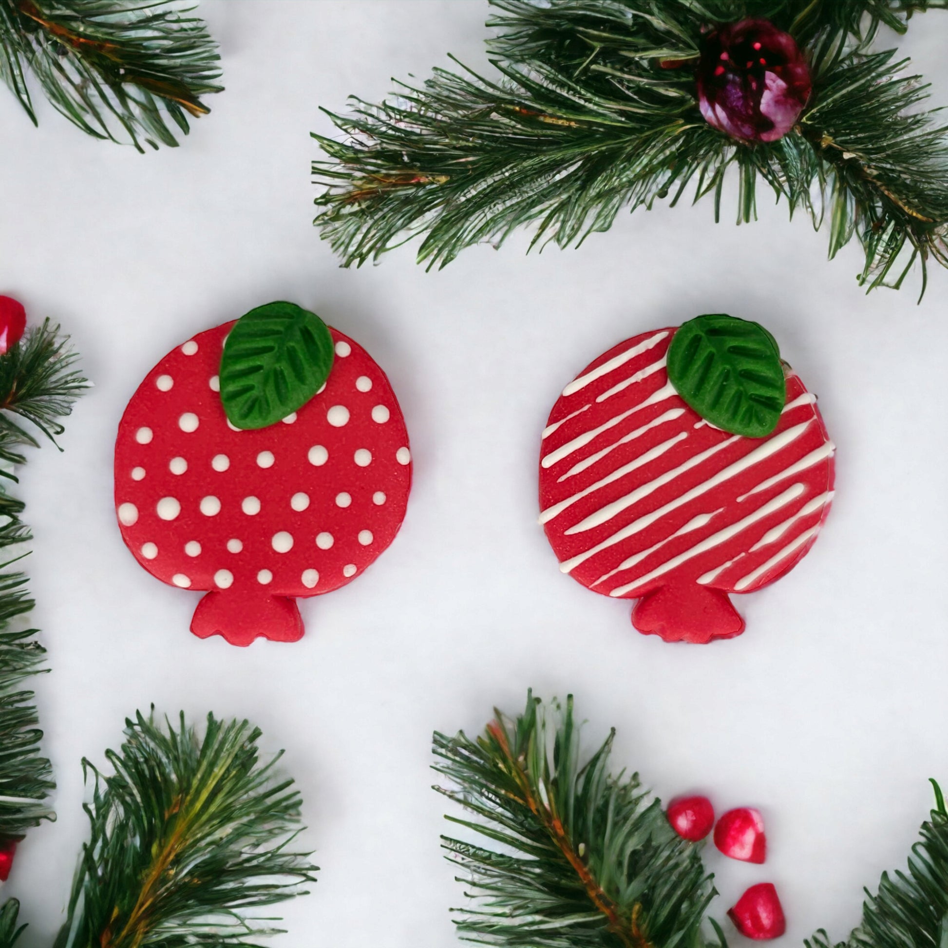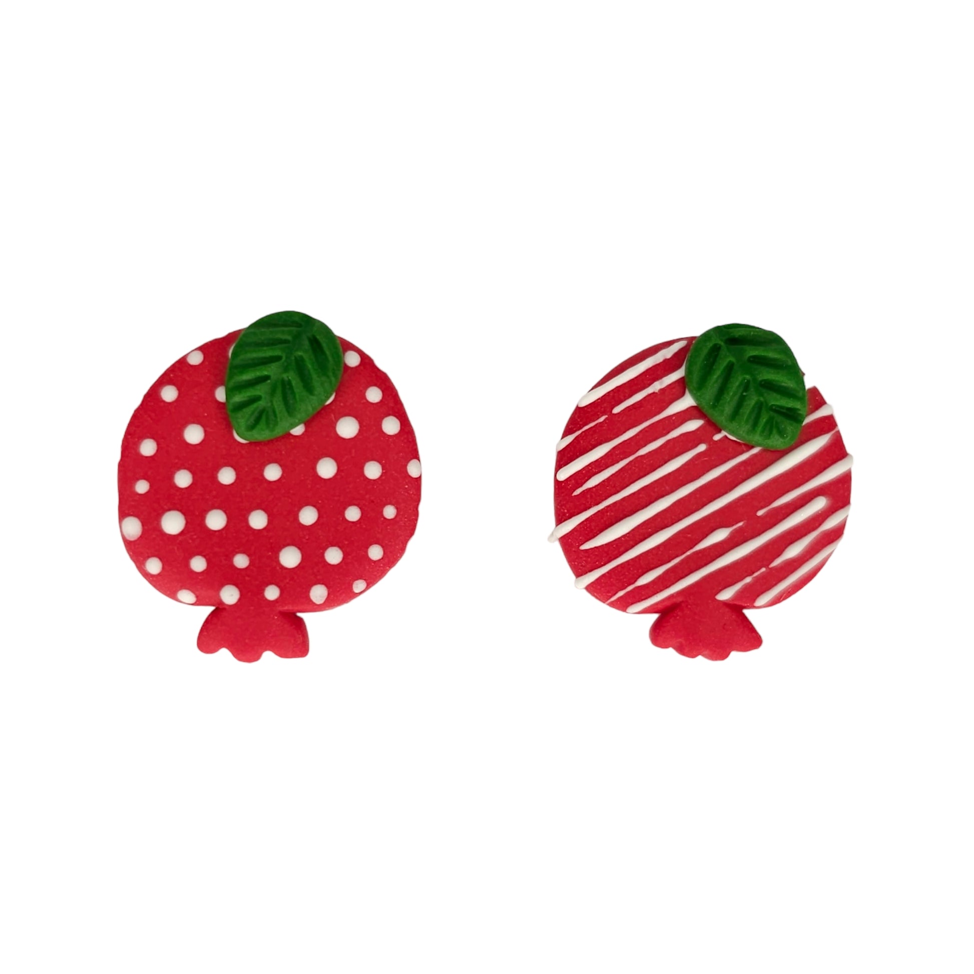 Ανόμοια καρφωτά σκουλαρίκια κόκκινα ρόδια, ένα με λευκό πουά κι ένα με λευκές ανάγλυφες ρίγες και μίνι πράσινα φυλλαράκια από πολυμερικό πηλό.