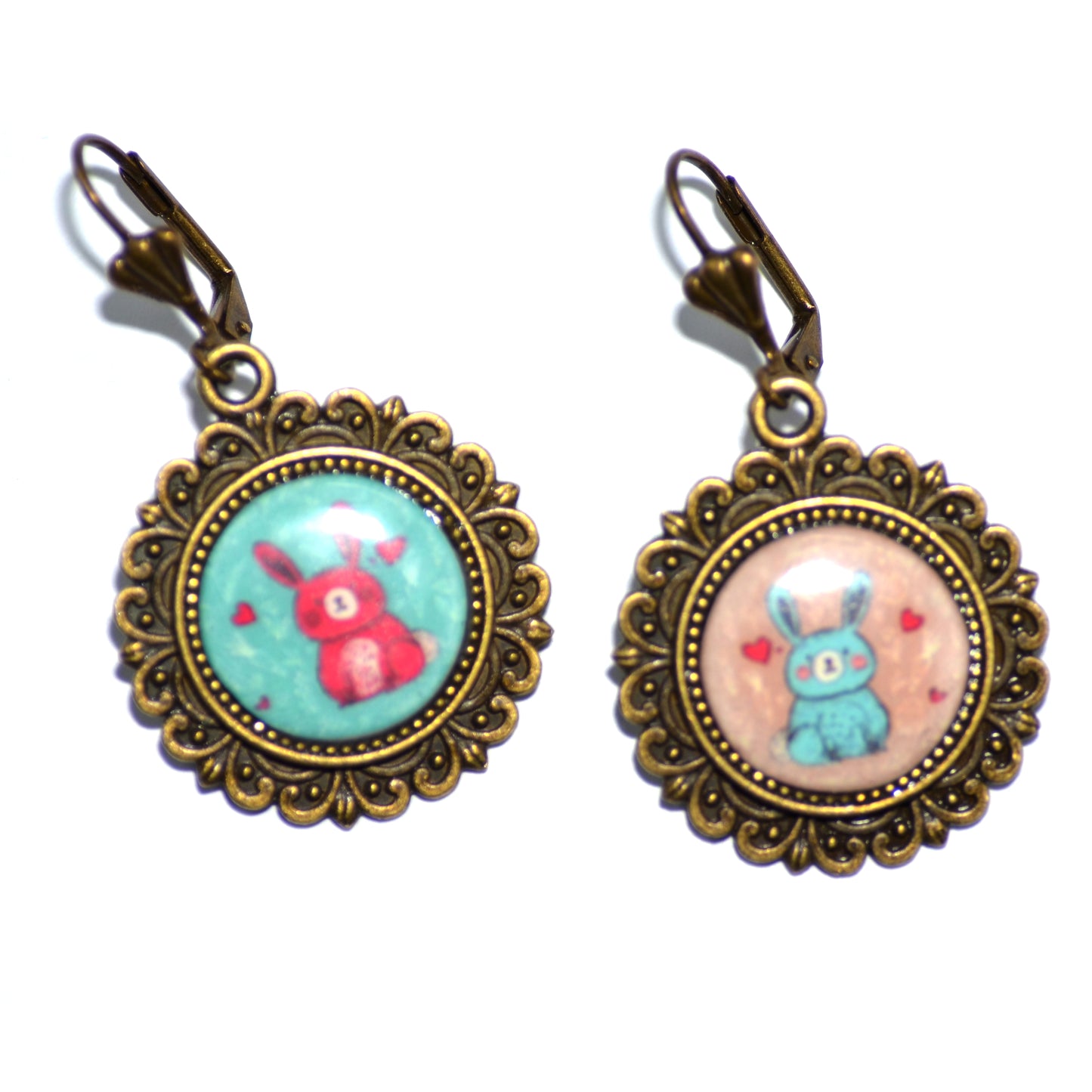 Σκουλαρίκια κρεμαστά βίνταζ μπρονζέ στρογγυλές βάσεις, με χειροποίητα καμποσόν από πολυμερικό με την τεχνική μεταφοράς εικόνας με καρτούν λαγουδάκια.