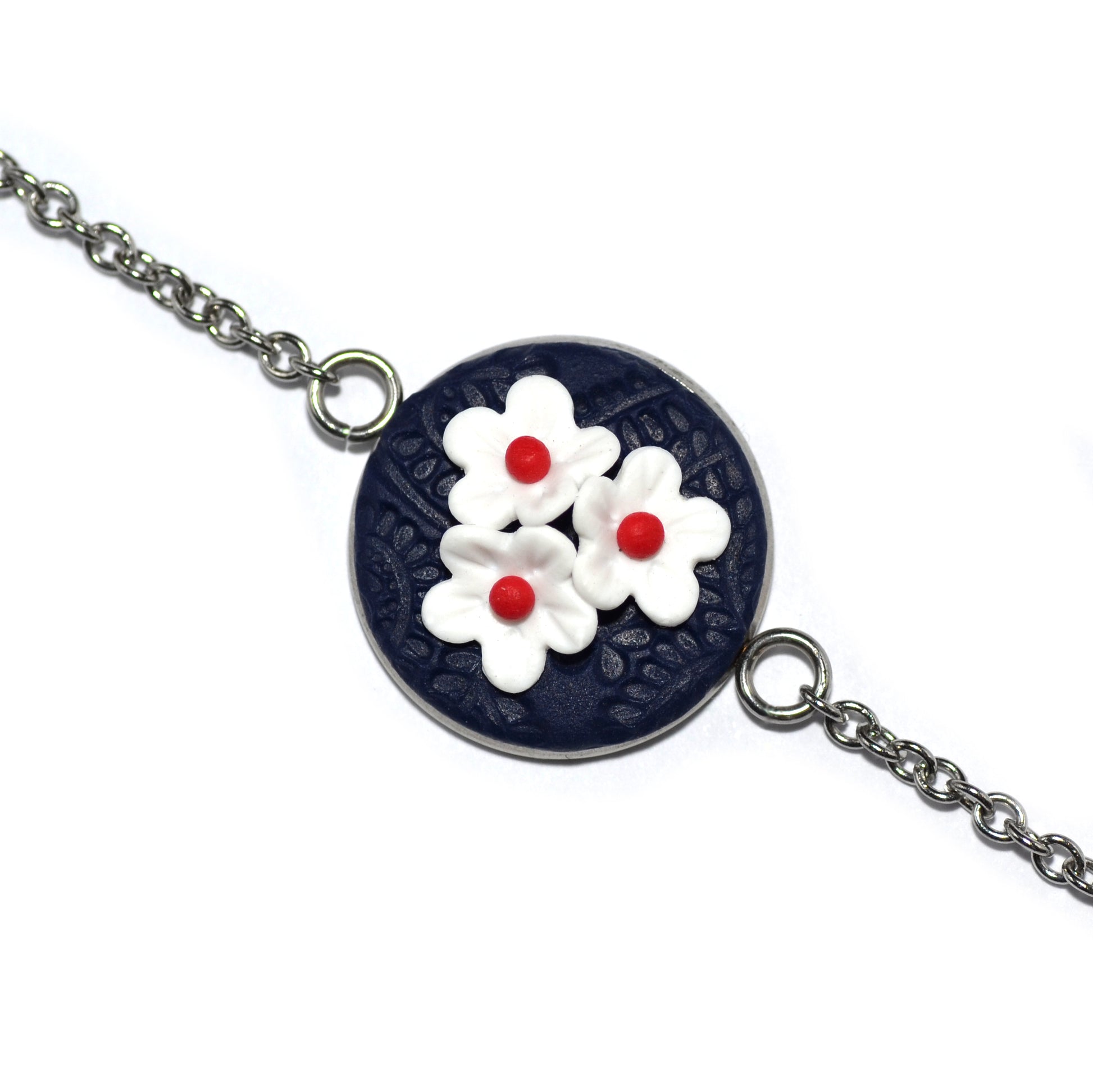 Στρογγυλό βραχιόλι με λευκά λουλουδάκια και κόκκινες λεπτομέρειες σε μπλε μαρίν φόντο από πολυμερικό πηλό.
