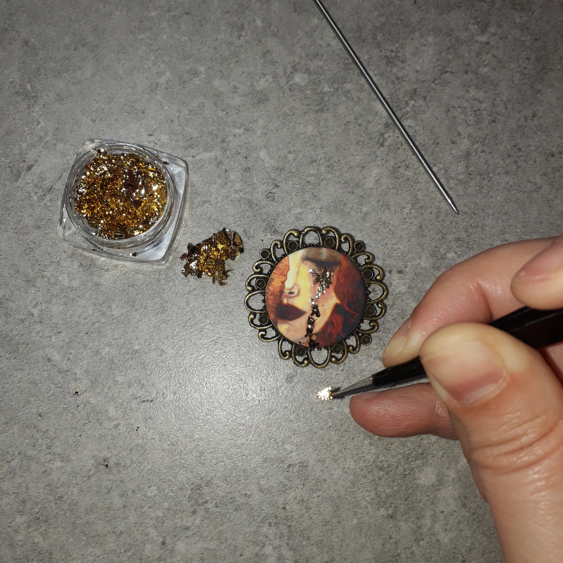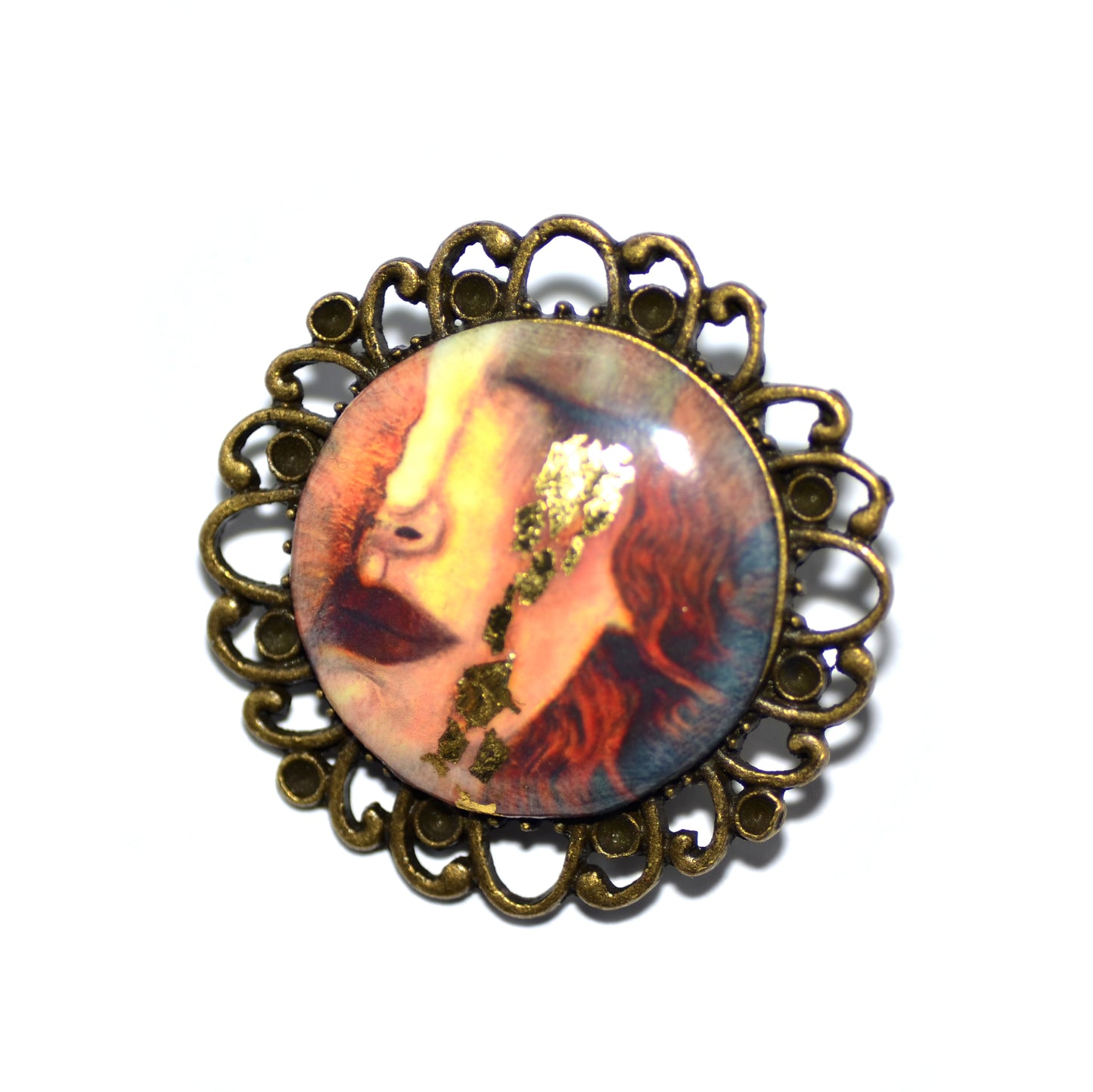 Βίνταζ μπρονζέ στρογγυλή καρφίτσα με χειροποίητο καμποσόν από πολυμερικό πηλό με τεχνική μεταφοράς εικόνας, με τον πίνακα Freya's tears του Klimt και φύλλο χρυσού.