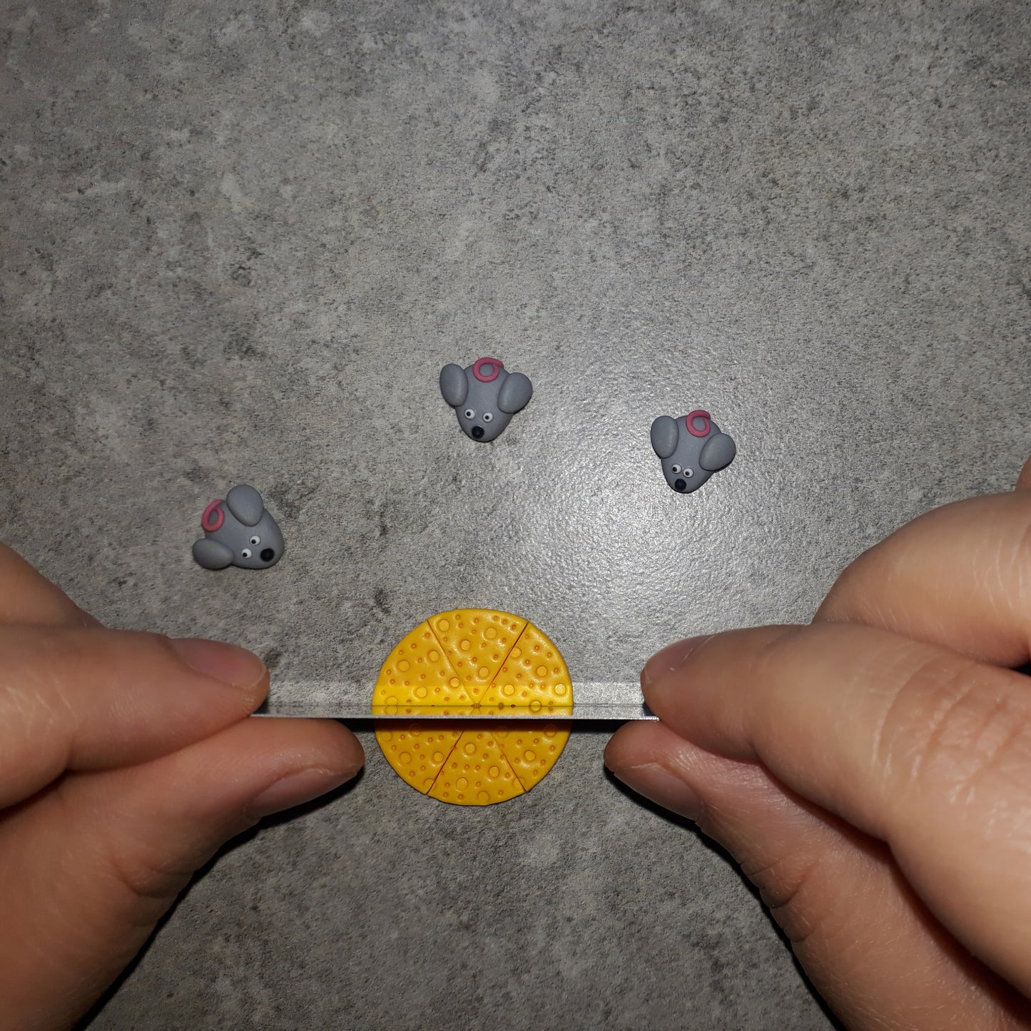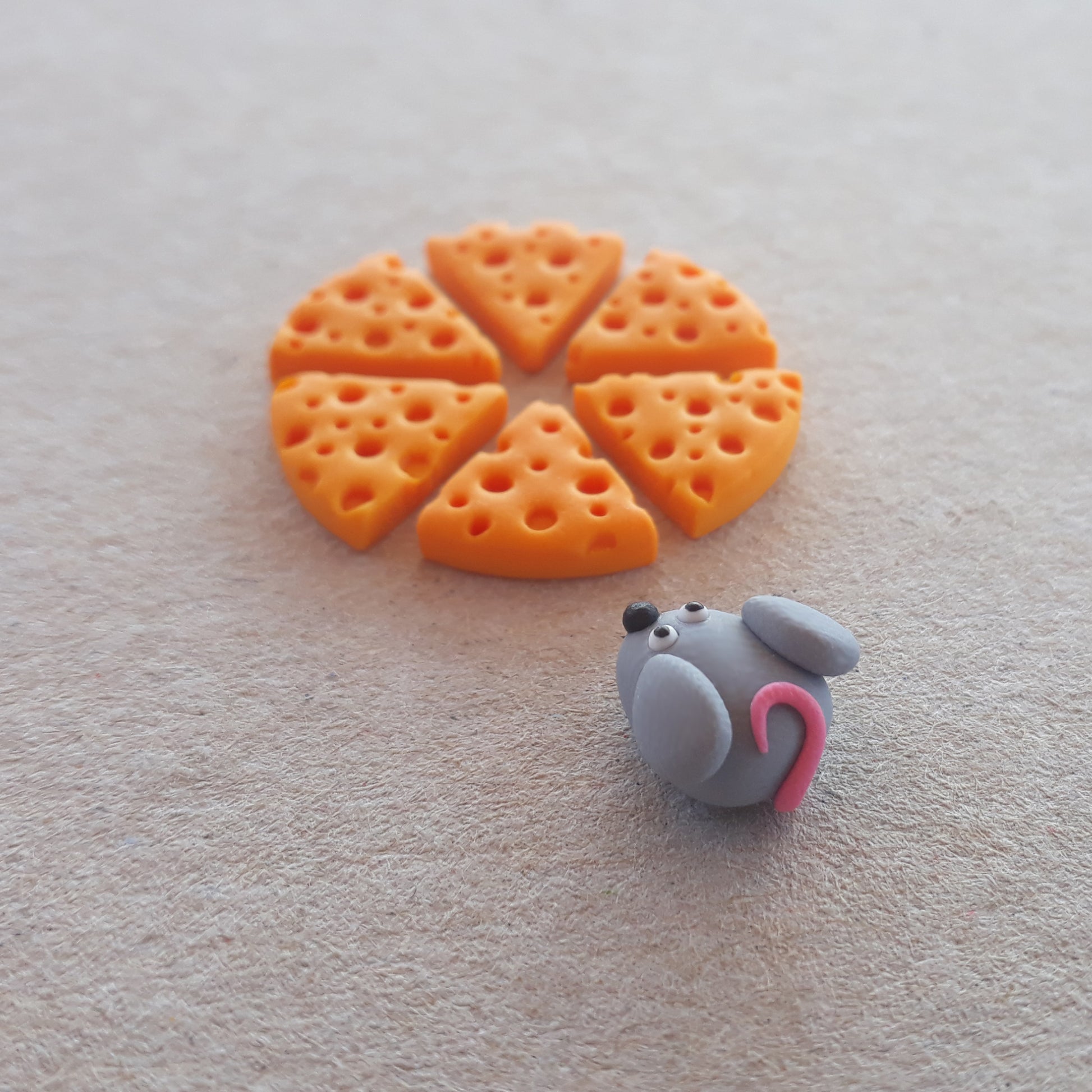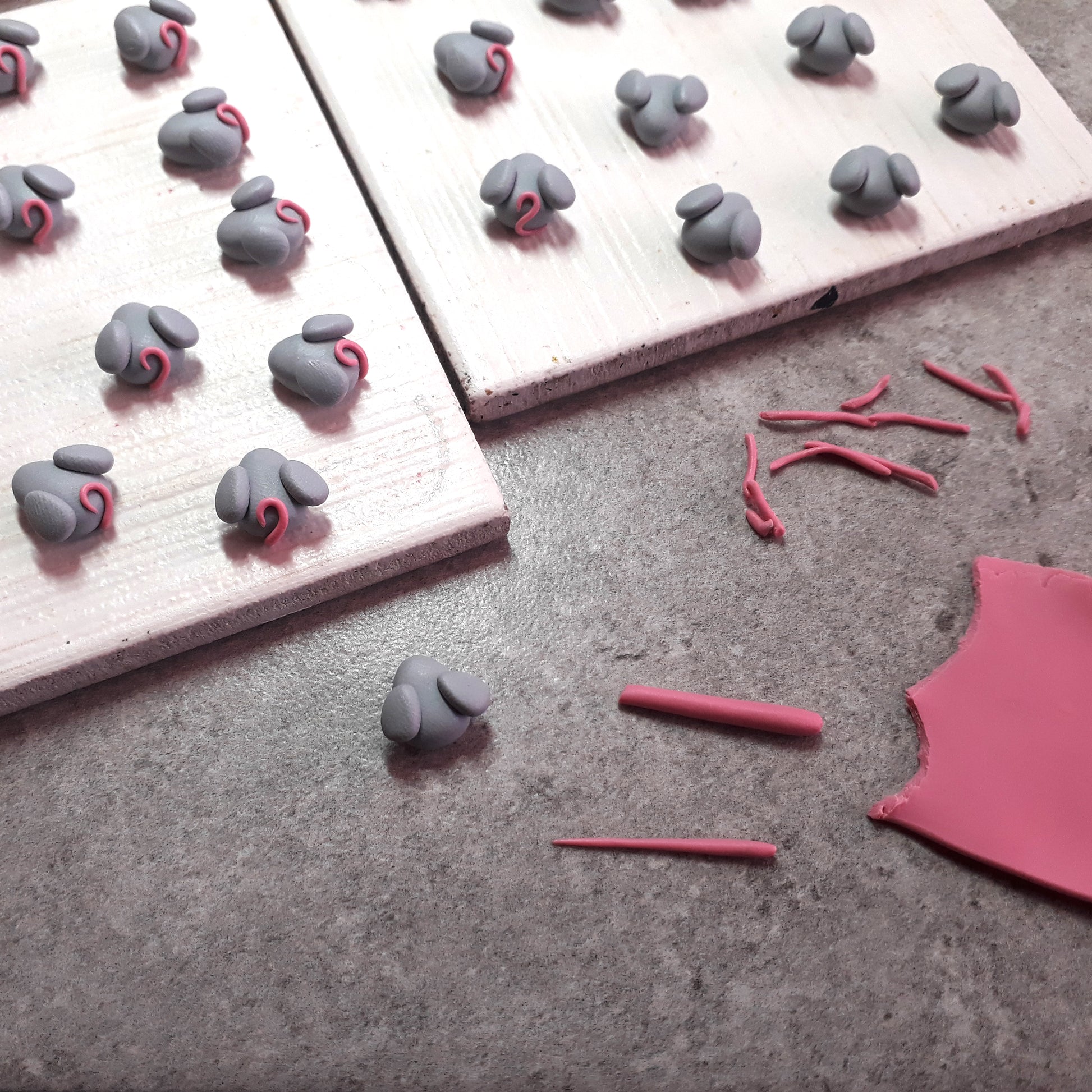 Γλυπτά σκουλαρικάκια με πολυμερικό πηλό, γκρι ποντικάκι με ροζ ουρίτσα και το τυράκι του.