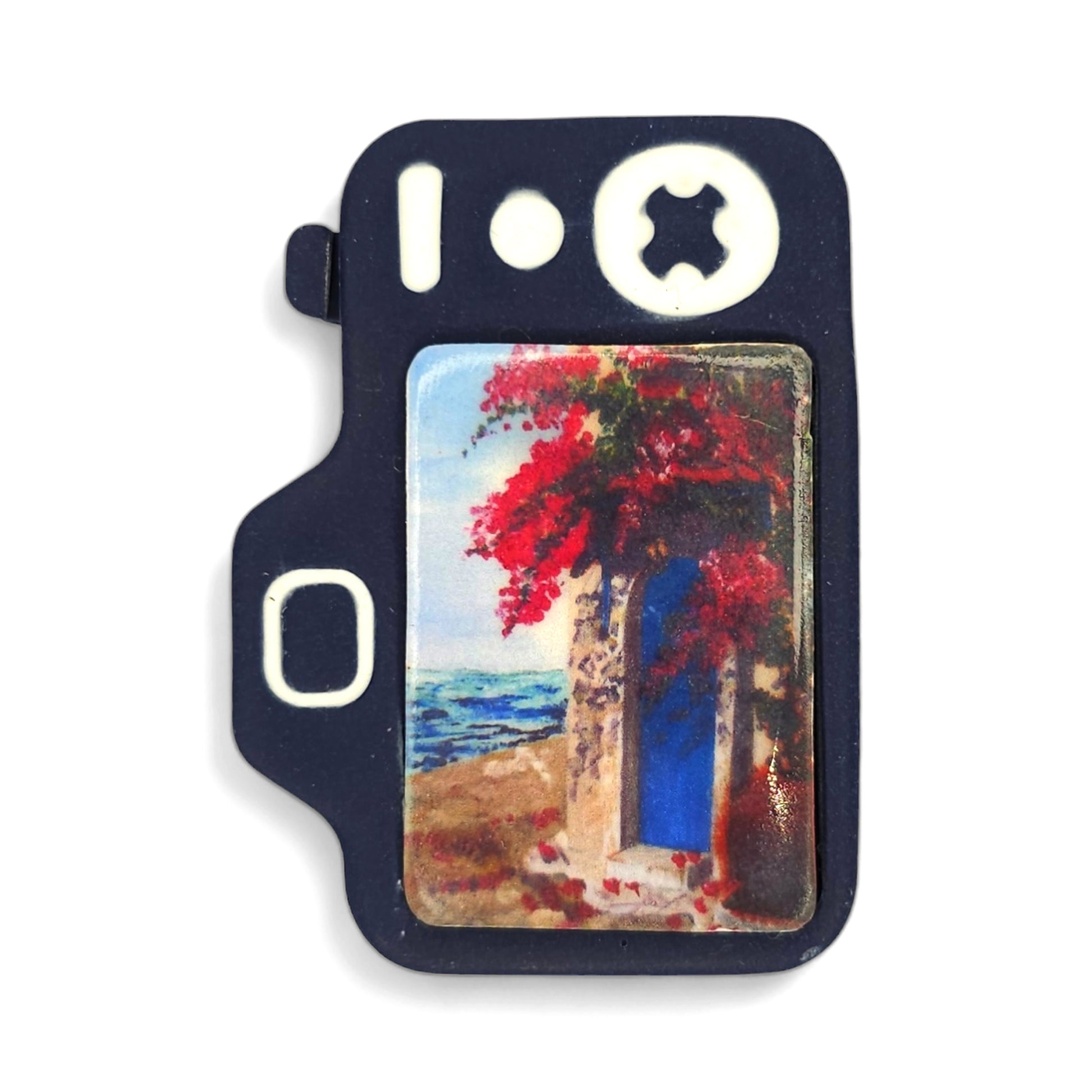 Καρφίτσα μπλε κάμερα με φωτογραφία ελληνικό νησί από πολυμερικό πηλό