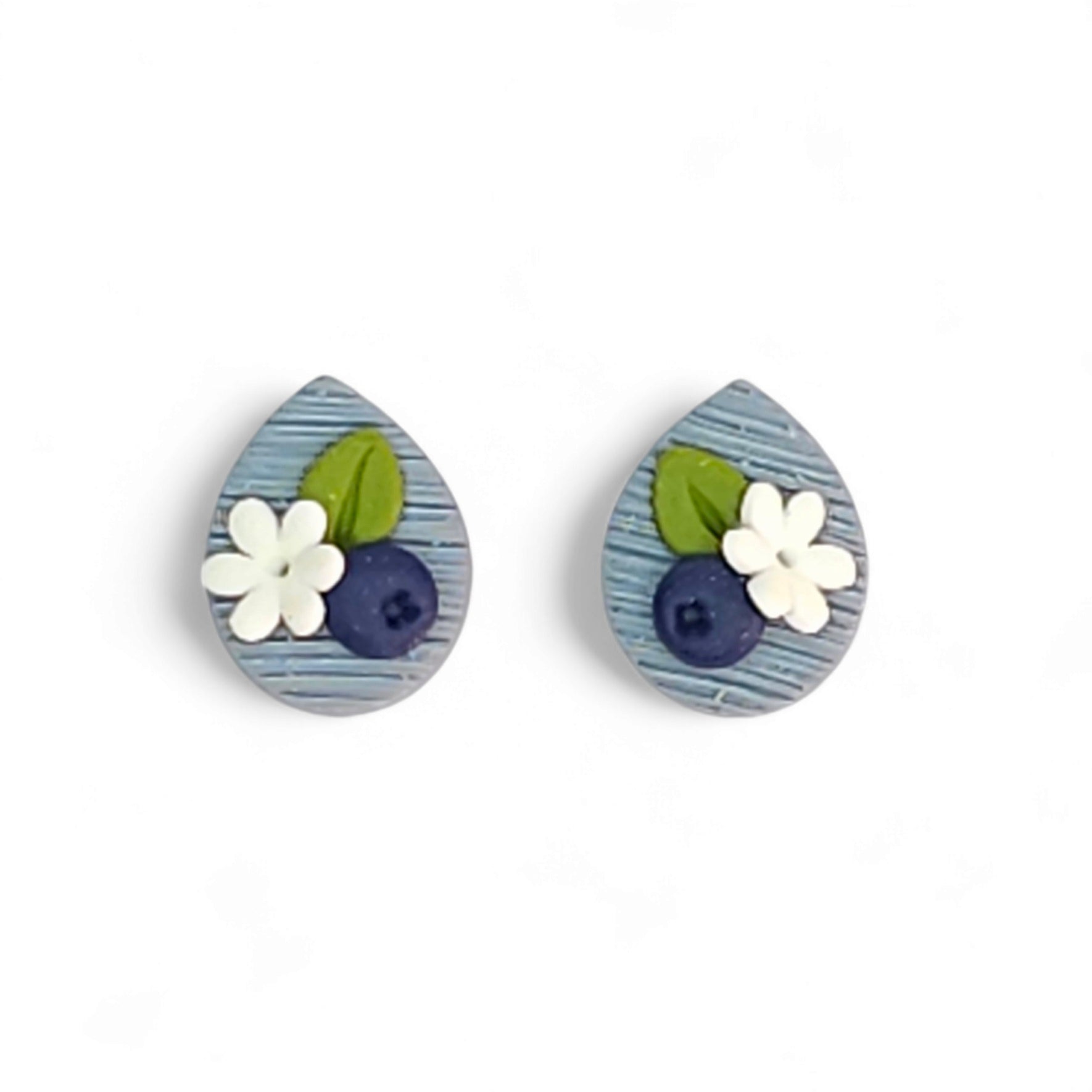 Καρφωτά μπλε-γκρι σκουλαρίκια δάκρυα με μπλε μύρτιλα λευκά λουλουδάκια και πράσινα φυλλαράκια από πολυμερικό πηλό.