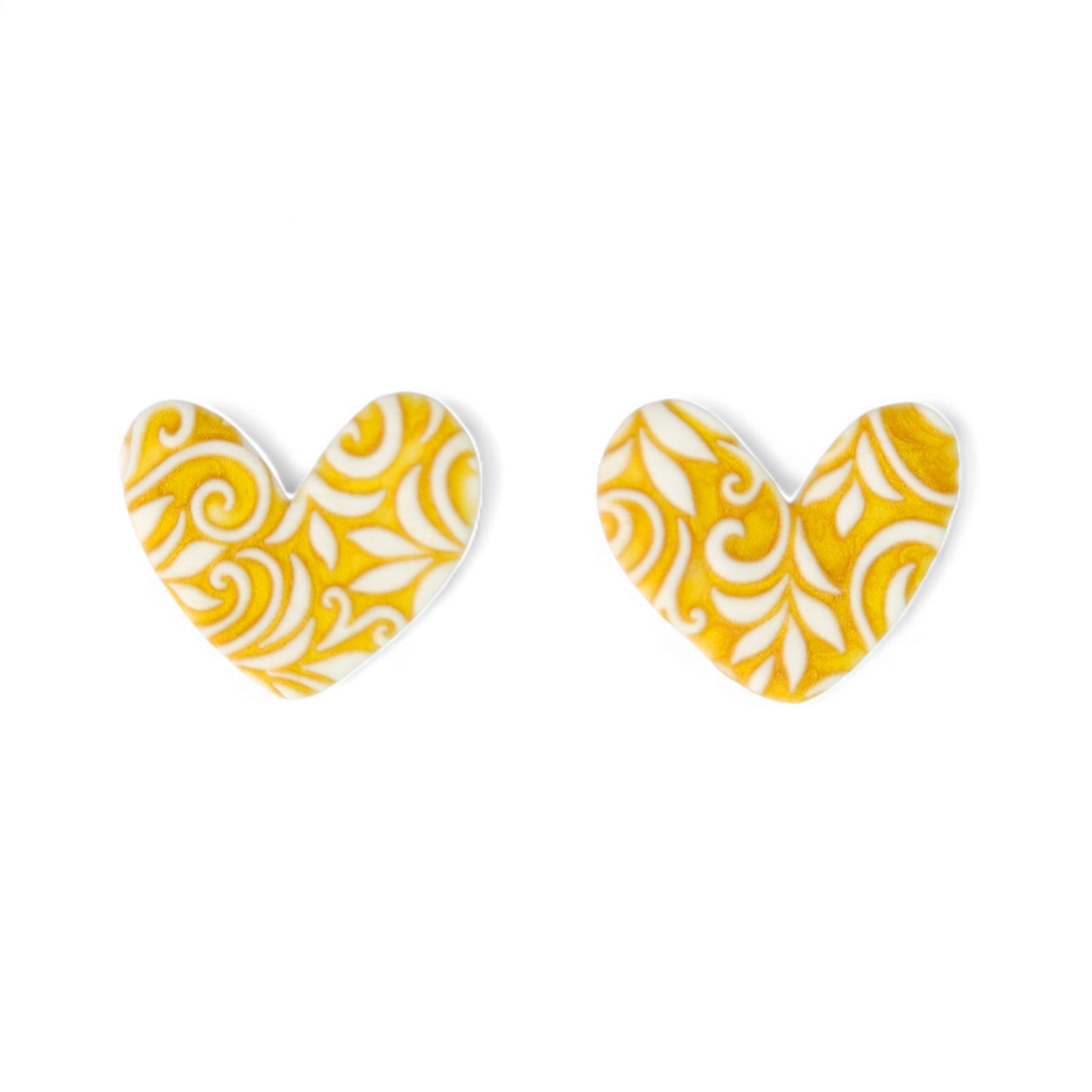 Καρφωτά σκουλαρίκια ανάγλυφες καρδιές σε λευκό με χρυσό από πολυμερικό πηλό.