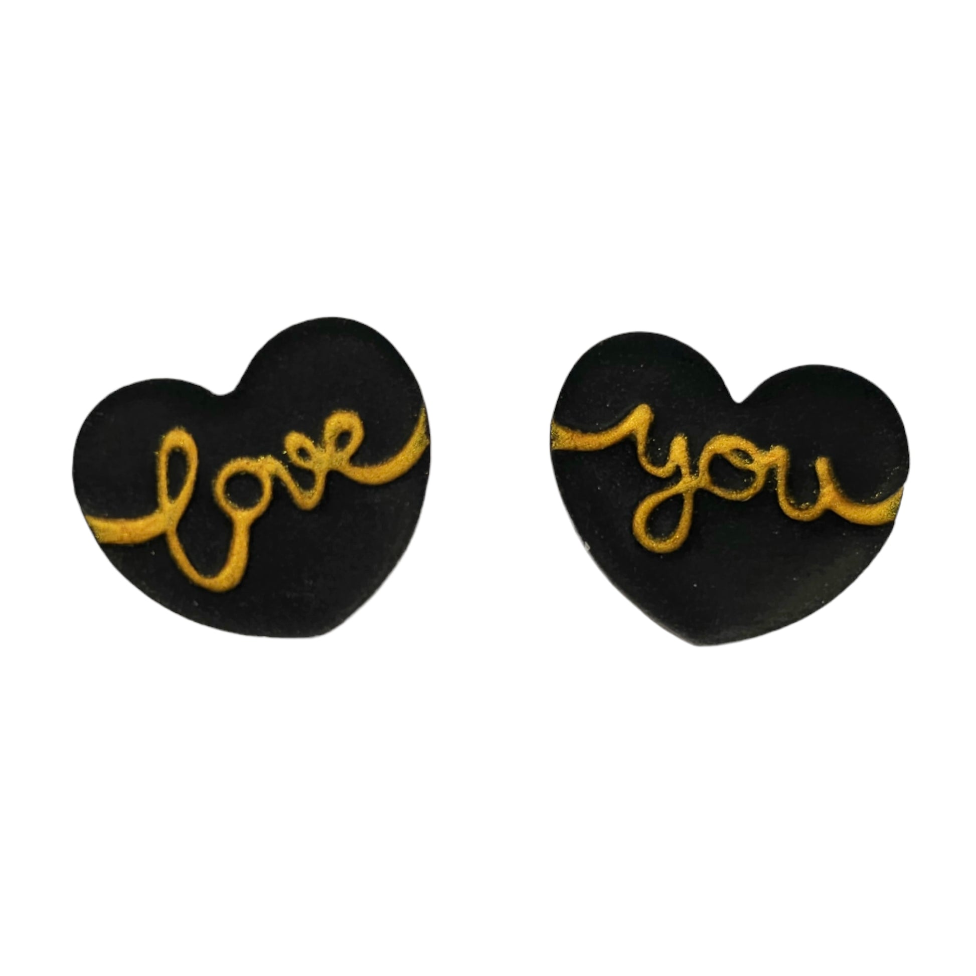 Καρφωτά σκουλαρίκια μαύρες καρδιές με γραμμένο το "love you" σε χρυσό από πολυμερικό πηλό.