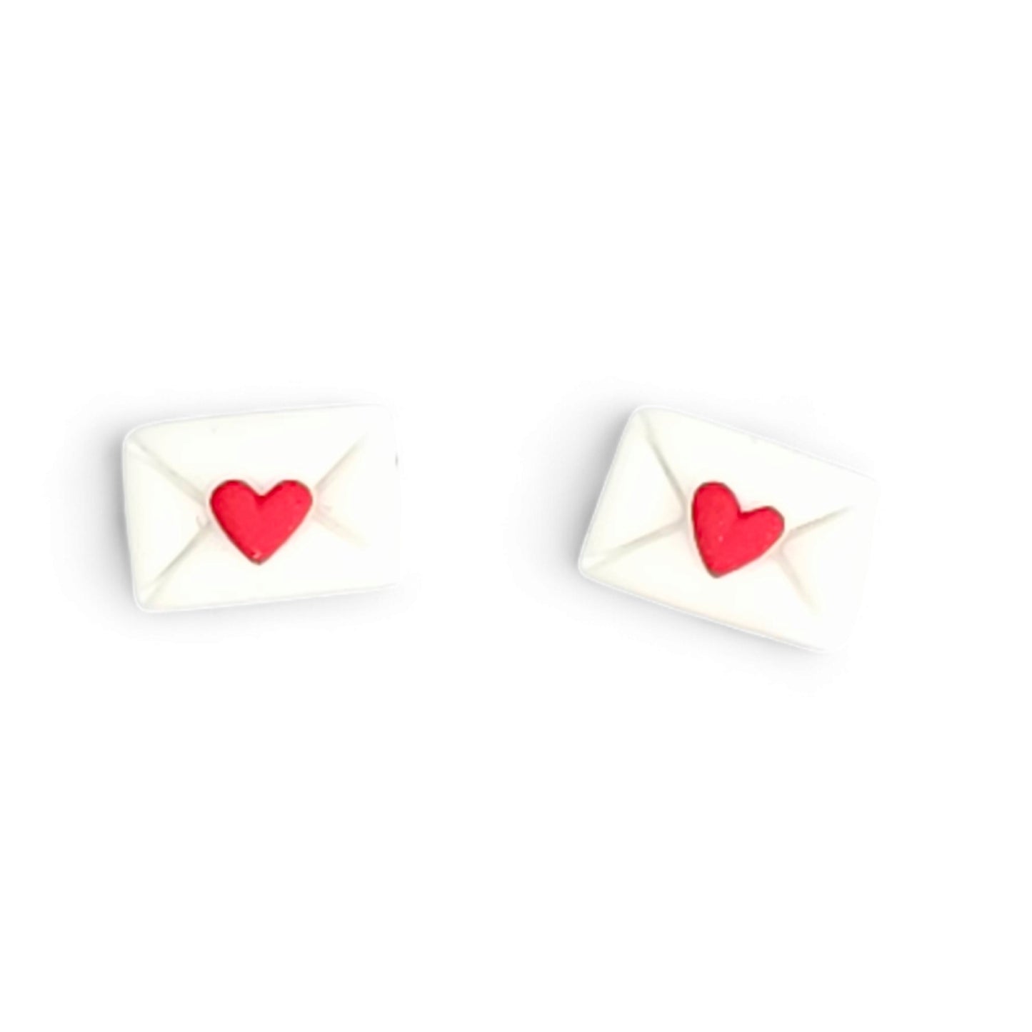 Καρφωτά σκουλαρίκια λευκά γράμματα με κόκκινες καρδούλες από πολυμερικό πηλό.