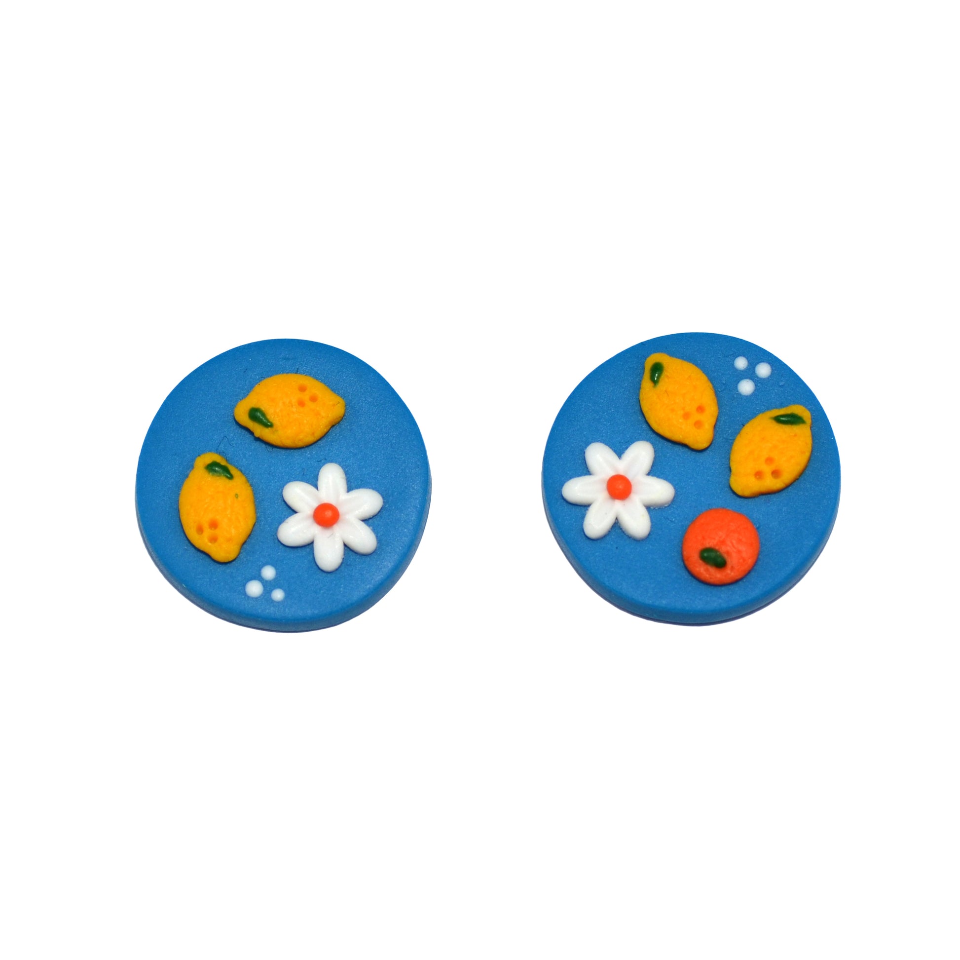 Καρφωτά σκουλαρίκια στρογγυλά εσπεριδοειδή, λεμονάκια, πορτοκάλι, λουλουλάκια, σε μπλε φόντο με τοσοδούλικες λευκές βουλίτσες στο χέρι από πολυμερικό πηλό.