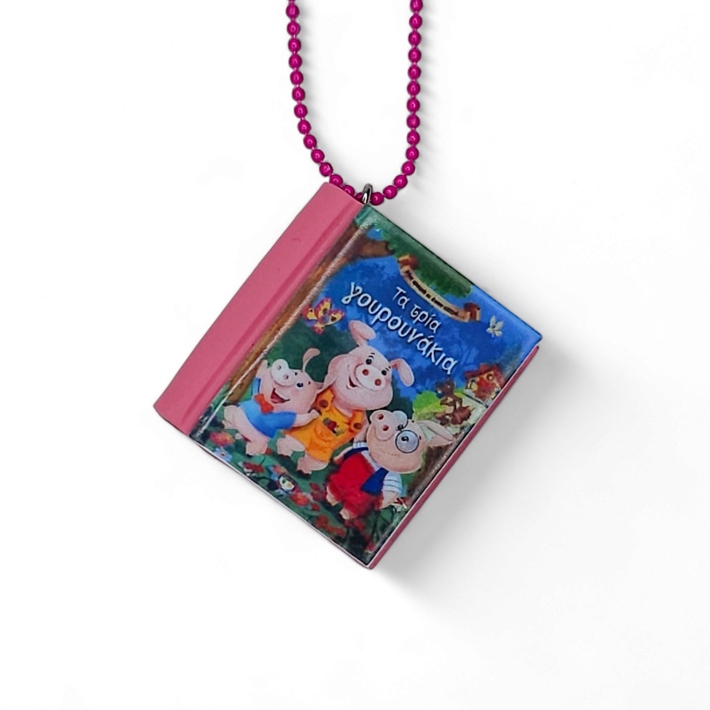 Κολιέ βιβλίο ροζ τα τρία μικρά γουρουνάκια από πολυμερικό πηλό