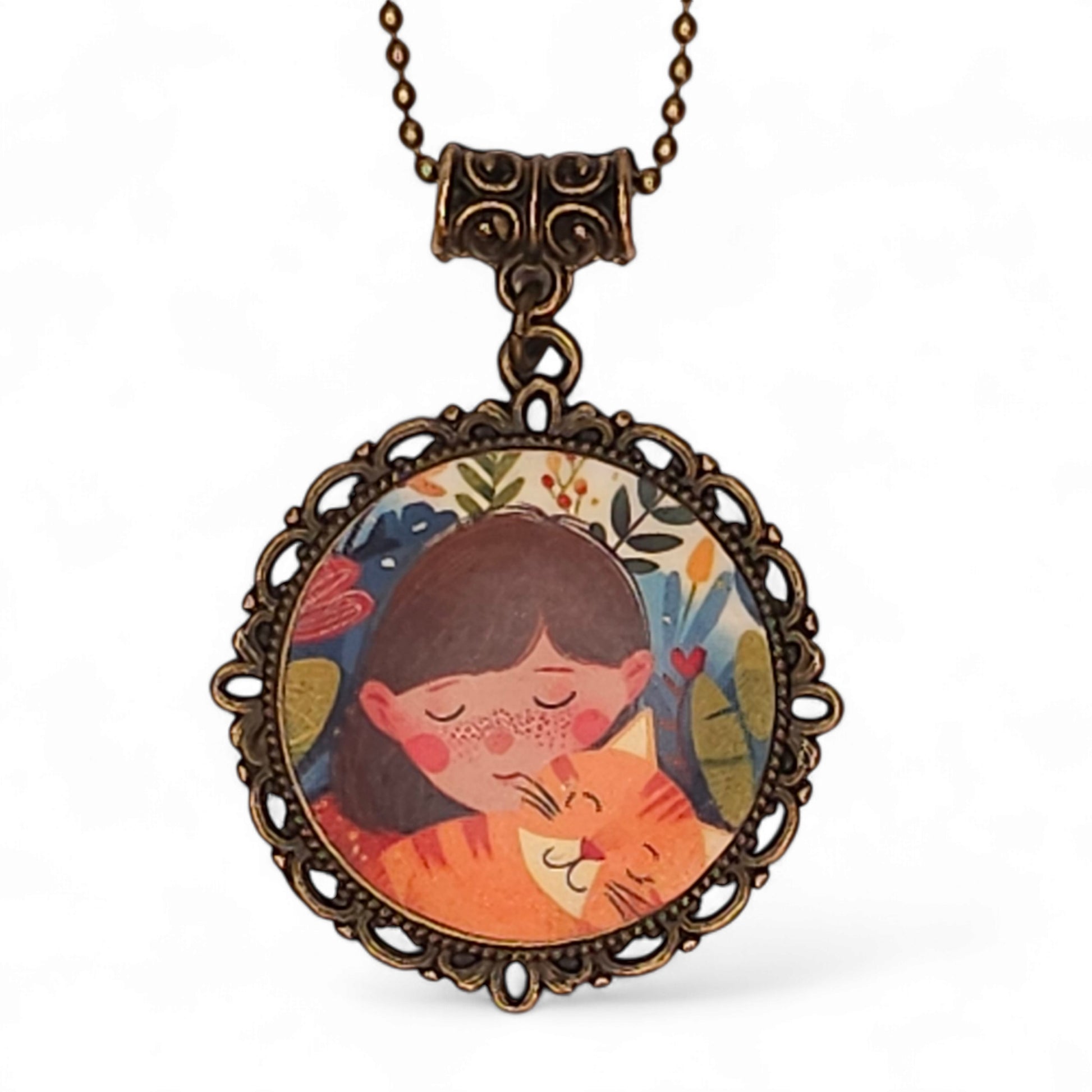 Κολιέ σε βίνταζ μπρονζέ στρογγυλή βάση με χειροποίητο καμποσόν από πολυμερικό πηλό με τεχνική μεταφοράς εικόνας κοριτσάκι με γατάκι στην αγκαλιά.
