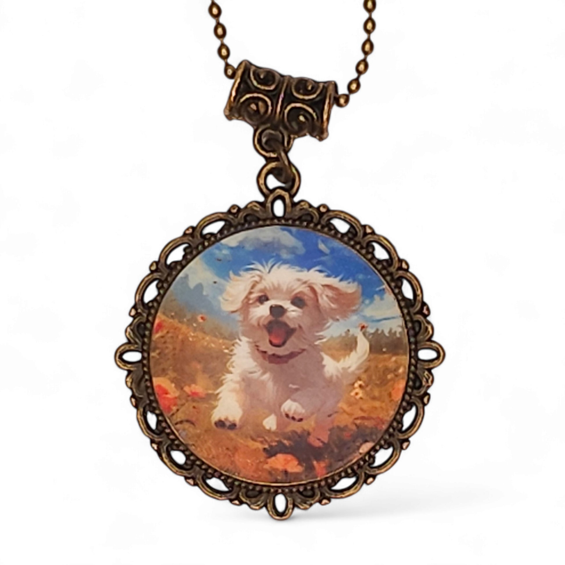 Κολιέ σε βίνταζ μπρονζέ στρογγυλή βάση με χειροποίητο καμποσόν από πολυμερικό πηλό με τεχνική μεταφοράς εικόνας χαρούμενο άσπρο σκυλάκι.