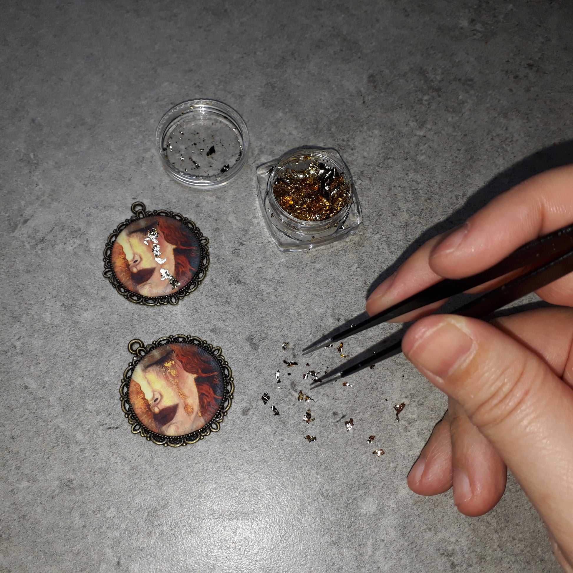 Κομψό κολιέ με vintage μπρονζέ καστόνι, καφέ σουέντ κορδόνι και πέτρα χρυσόλιθο. Το κολιέ έχει χειροποίητο στοιχείο από πολυμερικό πηλό που απεικονίζει μέρος του πίνακα "Freya's tears" του Gustav Klimt κι έχει διακοσμηθεί με κομματάκια από φύλλο χρυσού.