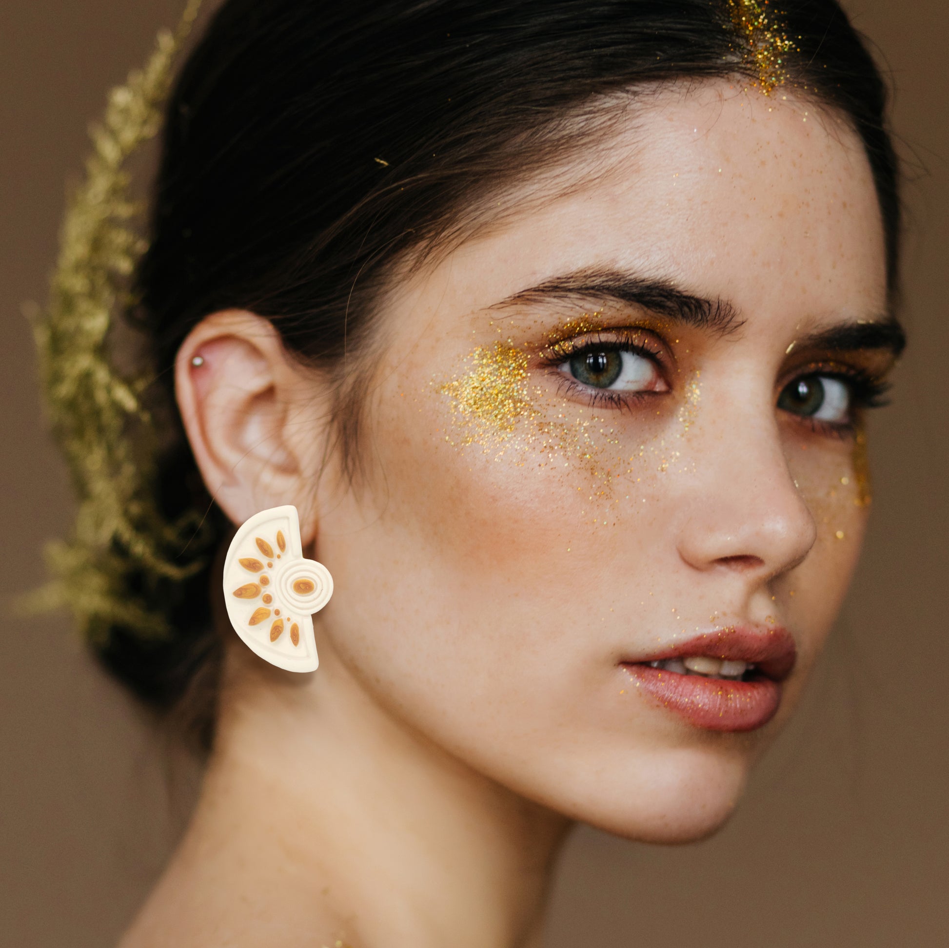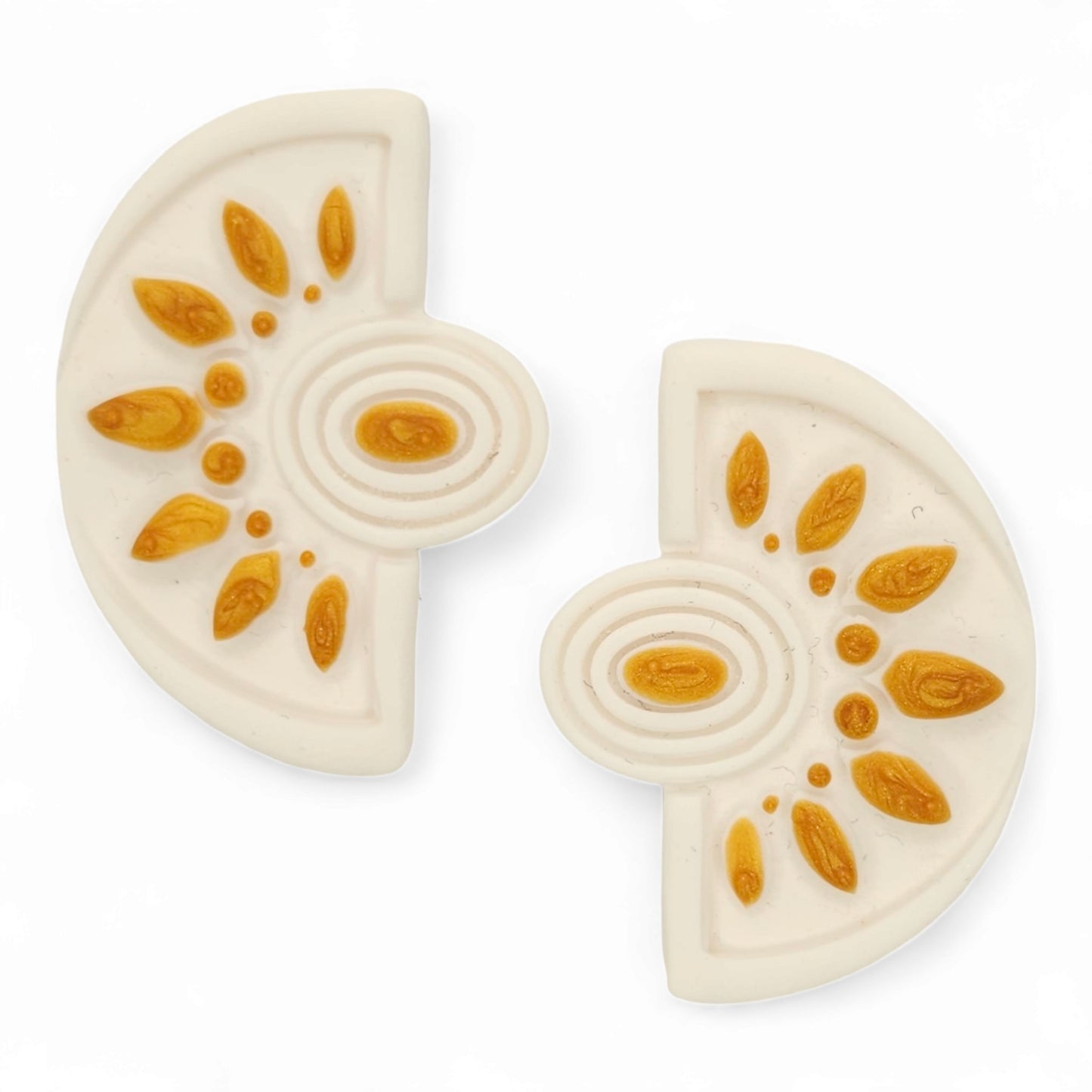 Κομψά καρφωτά σκουλαρίκια σε λευκό με χρυσές λεπτομέρειες από πολυμερικό πηλό.