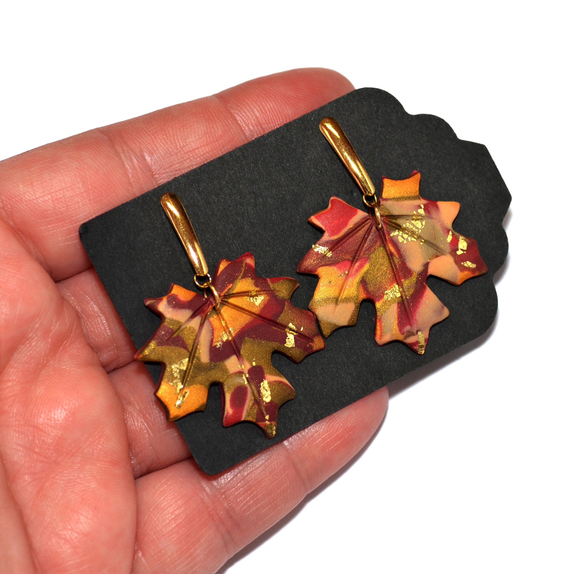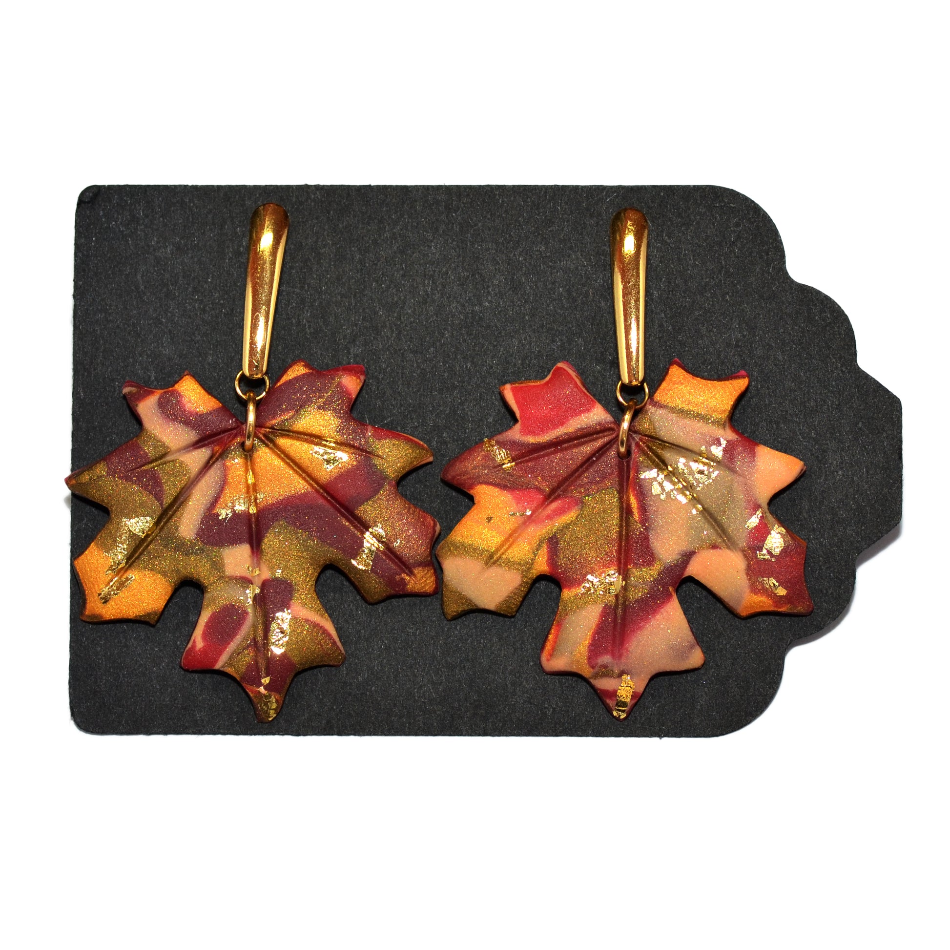 Κομψά κρεμαστά σκουλαρίκια, με ένα σταθερό επιχρυσωμένο ατσάλινο καρφωτό ραβδωτό στοιχείο κι ένα κρεμαστό χειροποίητο φύλλο σε μπορντό χρυσό μαρμαρωτό  μοτίβο από πολυμερικό πηλό.