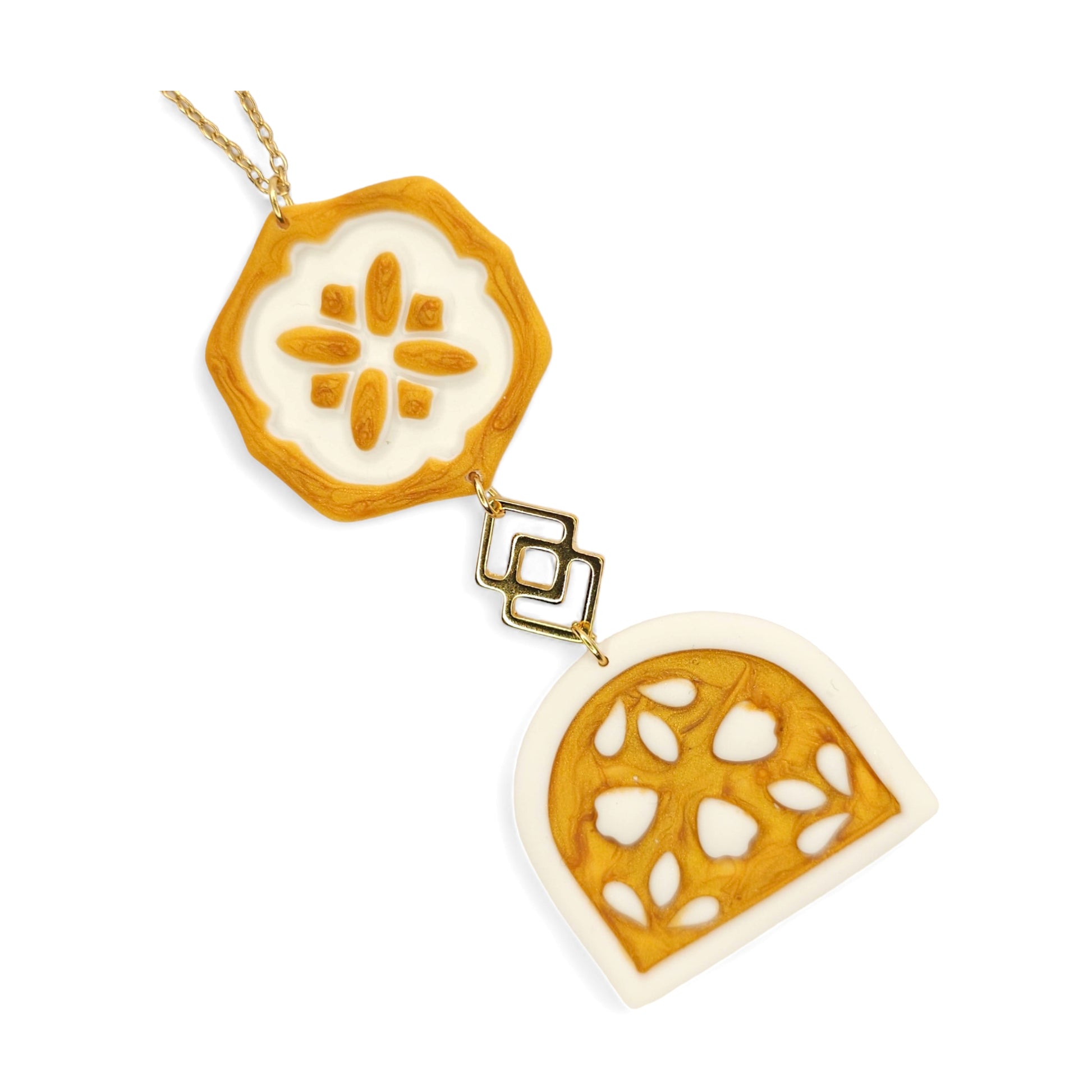 Κομψό μακρύ κολιέ με δύο ξεχωριστά στοιχεία σε λευκό με χρυσές λεπτομέρειες από πολυμερικό πηλό, ένα επιχρυσωμένο ατσάλινο συνδετικό στοιχείο και υποαλλεργική επιχρυσωμένη ατσάλινη λεπτή αλυσίδα.