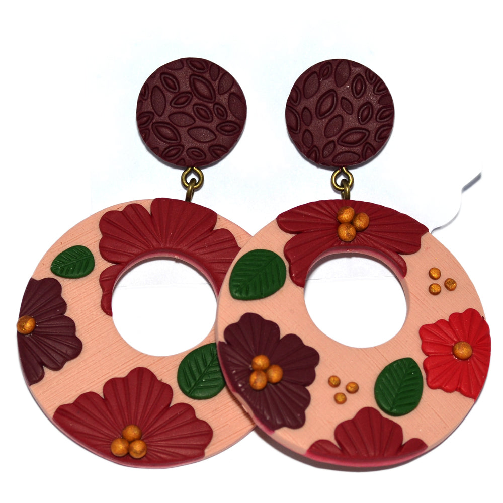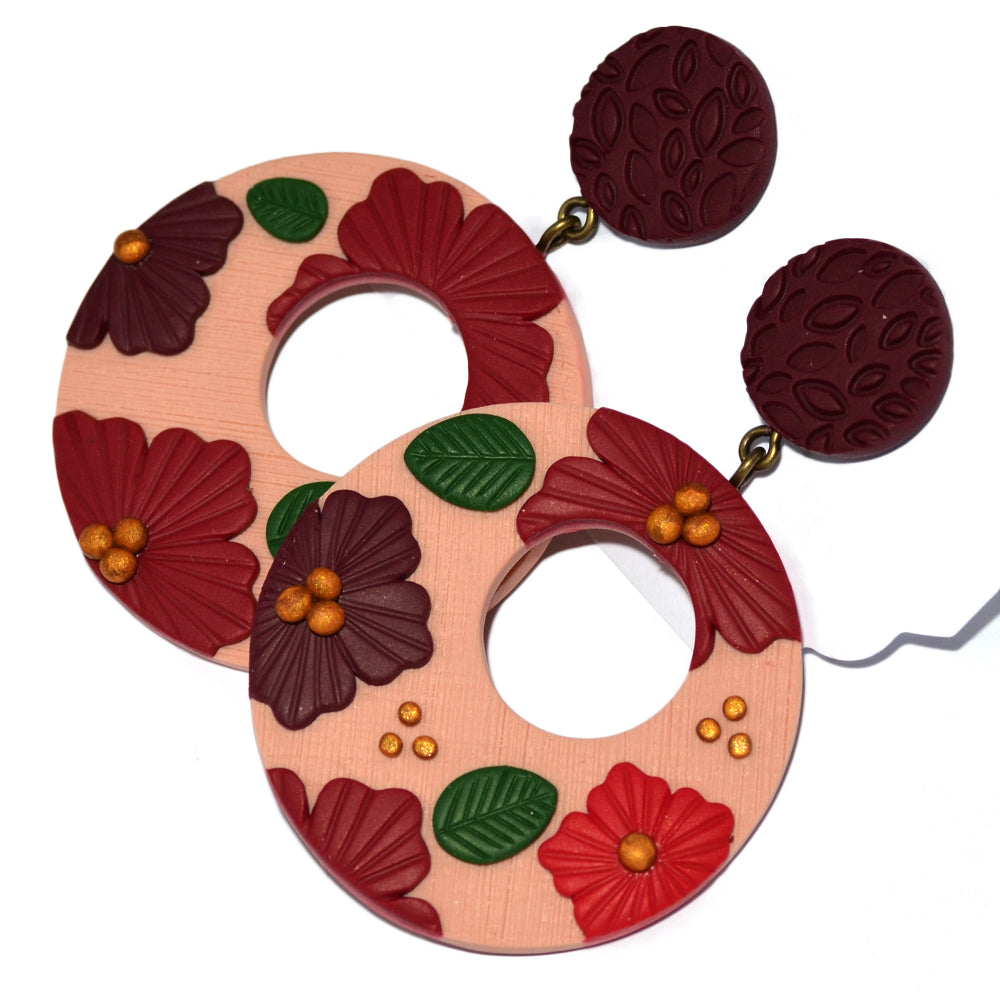 Κρεμαστά μεγάλα σκουλαρίκια με ανάγλυφα λουλούδια από πολυμερικό πηλό σε μπορντό αποχρώσεις.